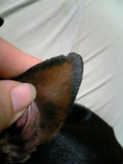 聞いていたとおり、耳の周囲がグルッと硬くなっていて、可哀相に一箇所が欠けている。欠けた部分はどこまで再生するか判らないけれど、せめてこの他のパリパリの部分は欠けることなく綺麗に治るといいのだけど…。